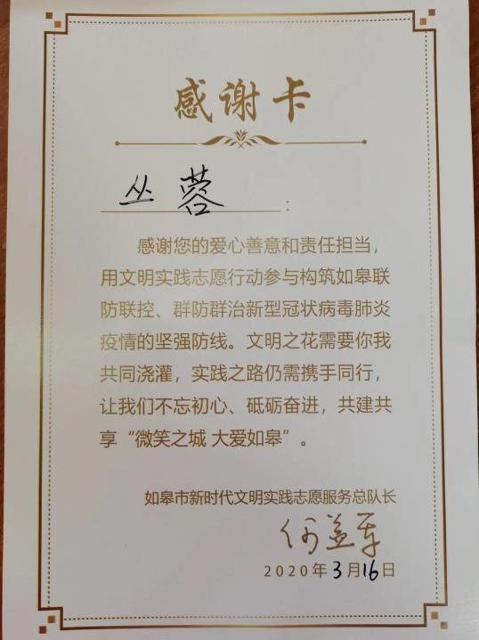 疫情期间,她利用假期时间,2、3月份在如皋市城南街道张八里社区疫情防控卡口,协助当地社区做好卡口监测工作。工作期间,不计辛劳、不计报酬,尽心尽力地帮助记录,落实“两查一对”。在条件非常简陋的情况下,冲在前线,帮助测量来往人员的体温,检查电子健康通行证,检查是否佩戴口罩,对外来人员做好信息登记。丛蓉同学用行动证明了当代大学生的担当和使命,志愿服务工作结束以后,她收到了来自如皋市新时代文明实践志愿服务队的感谢卡。